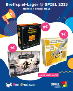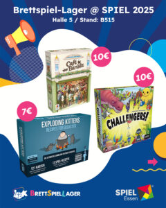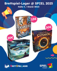 Die SPIEL 2025 in Essen steht vor der Tür und auch das Brettspiel-Lager wird natürlich wieder vor Ort sein. Stark reduzierte Brettspiele warten auf euch in unserem Messe-Shop in Halle 5, Stand B515! Wie immer gilt, nur solange der Vorrat reicht.